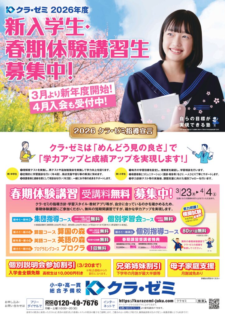 新学年のスタートは、この春で決まります。クラ・ゼミ馬郡校では小中学生を対象に春期講習を開講いたします。 前学年の総復習と新学年の内容の先取りを行い、「わかる」から「できる」まで確かな学力を育てます。た基礎力・応用力の強化にも力を入れています。タブレットを使用した学習と、講師による質問対応で、理解度に合わせて丁寧にサポートさせていただきます。学習習慣を整え、自信をもって新学期を迎えませんか。無料体験・学習相談も受付中です。この機会にぜひご参加ください。