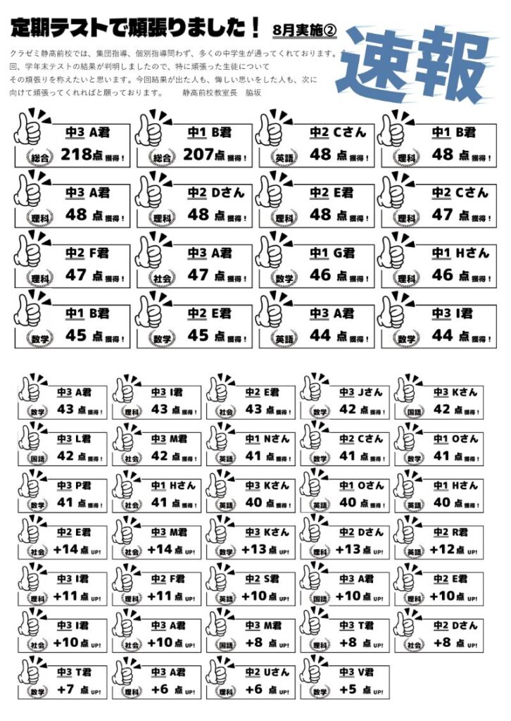 先日もお伝えした通り、8月末に実施された定期テストで、当校の生徒たちが素晴らしい結果を出してくれました。今回は、新たに判明した優秀者の皆さんを加えて新たにご紹介します!皆さんの日々の努力が、このような素晴らしい成果につながったことを、私たち講師一同、心から嬉しく思います。