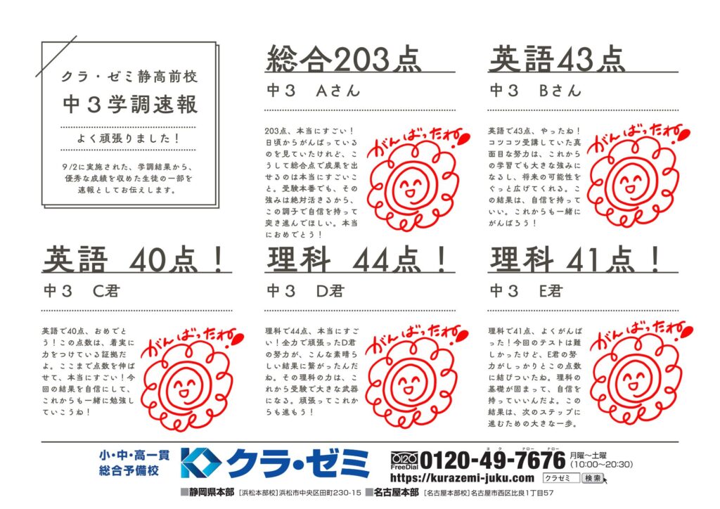 【学調速報】クラ・ゼミ静岡前校 中3生が大躍進!