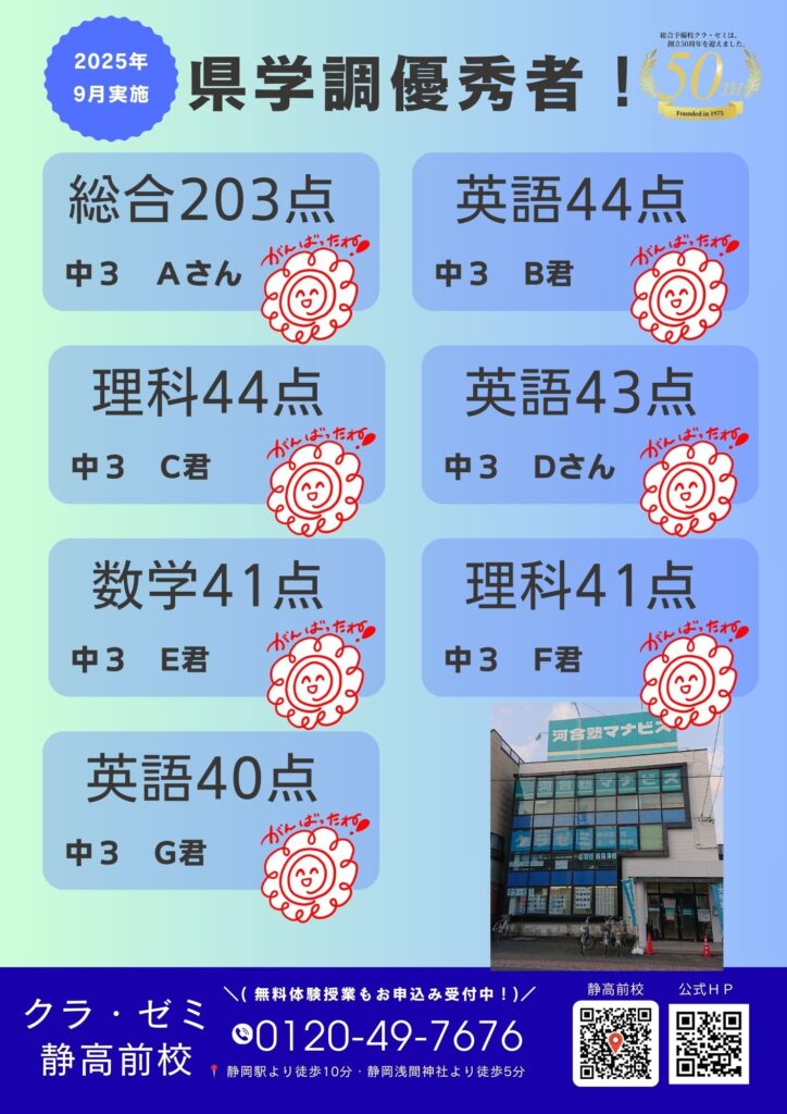 9月に実施された静岡県学力調査(学調)の結果速報に、またまた嬉しい報告が届きました!前回お伝えした優秀者に加えて、新たに素晴らしい成績を収めた生徒たちが判明しましたので、改めてご紹介します。※一部抜粋