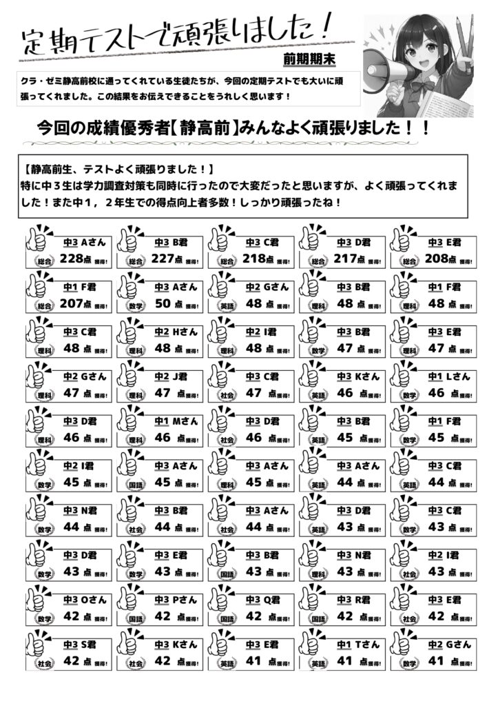 前期期末テストで静高前生たちが大活躍!静岡市葵区の学習塾で着実に成績アップ!