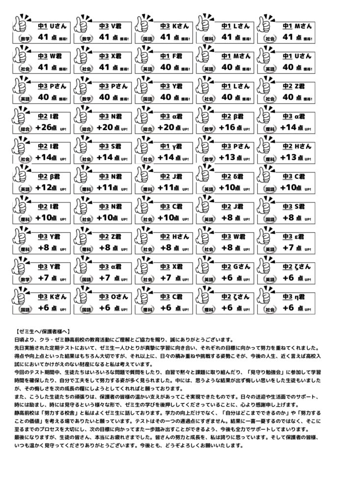 この度、クラ・ゼミ静高前校の前期期末テストの結果がまとまりました。