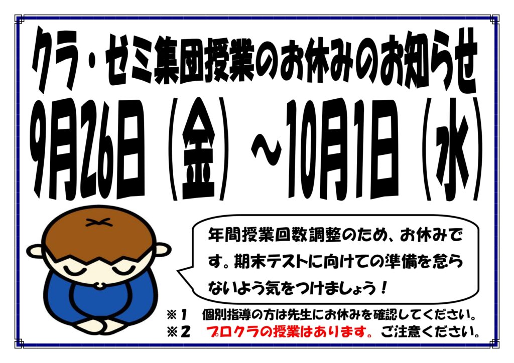 クラ・ゼミ馬郡校は上記期間の集団授業はお休みとなります。