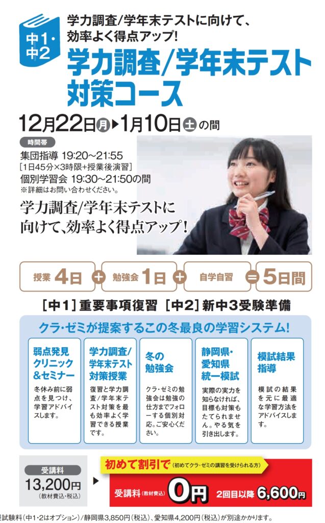 ========= 2025年冬期講習の特別! #初めて割引(年長~中2):★受講料0円! (2回目以降受講料半額!) #個別指導コース(小1~中2):★50%OFF! #中12集団コース:授業+勉強会+★自学自習 ========= お知らせ クラ・ゼミの2025冬期講習生の募集がいよいよ始まり、富士見校でも全コースの募集をしています! しかし、いきなり申込は…、資料請求?クラ・ゼミに電話?などあるかもしれません。ですので、今回は『冬期講習に興味はあるけれど…もう少し知りたい!』にお答えしたいと思います。 クラ・ゼミ富士見校では、中学生コースとして集団指導・個別指導コースがありますが、今日は集団指導コースの【冬期講習の意図・内容】についてご紹介します。 【集団指導コース】 <基本情報> ・対象学年:中学1年生~3年生 ・指導科目:5教科 ・実施曜日: ※富士見校 予習授業(知識) 水曜日・土曜日 各勉強会(定着) W勉強会月曜日、授業後演習、テスト前勉強会(テスト前の日曜日) ・指導時間:19:20~22:00。 このコースの最大のポイントは、『全ての教科や分野をバランス・効率よく勉強(理解)し、定着させる!集団なのに個々に対応!』です。 ただ分かった・理解したではなく、理解して自分で解けるまでとことん付き合います!そのため確保している日数や時間も週3日と多いです。また、仲間やライバルたちと一緒に切磋琢磨し、自分の持っている力以上の力を発揮できる!のも魅力の一つです! ★集団指導:中1・2『学力調査対策コース【集団】(志望校合格への力をつける)』 ※冬期講習の概要については、HPの冬期講習のチラシをご確認下さい。 ◆2025冬期講習(各学年の意図・内容・流れ) (対策授業4日間+勉強会1日+★自学自習) ========== ①中学1年生の意図・内容 ⇒★実力テストに対する勉強方法を、初めて伝授します! 【意図・内容】 これまで定期テストを3回受けてきて、難しくはなりつつもその勉強方法はある程度分かってきたのではないかと思います。 しかし、それだけでは中学校での勉強は不十分です。 より範囲の広い★実力テストでも力を発揮できるように、その勉強方法の確認と練習・訓練が必要です。 実力テスト対策は、恐らく中学1年生の皆さんは誰もが初めてです。しかも、イベントだらけの冬休みの後1/8(木)に実施されます。 さらに、学校の成績に入らない・順位が出ない(学校によって出るところもありますが)となると、学調へ向けて勉強する意味もなかなか見出すことが難しいのではないでしょうか。 学校によっては、宿題として過去問が配られたりもしますが、ただ解くだけ…ともなり兼ねません。 ただ、ご安心ください! クラ・ゼミ富士見校では、意味付けも含めて、冬期講習を通して対策をしていきます。しっかり対策し実力テストでも成功体験を積めるよう指導致します。ご期待下さい! ========== ②中学2年生の意図・内容 ⇒★受験スタートと捉え意識向上を目指します! 【意図・内容】 2年生にとって学調は、1年生の時に一度経験している分、イメージが付きやすいのではないでしょうか。ただ、1年生の時とは意味合いが全く違います!我々は『受験スタート』と捉え本気で向かわせます。 志望校について聞くとさすが2年生、ここに行きたい!と答えてくれますが、理由も聞くと自分の(今の)学力からここなら行けそうだからと返ってくることも多いです。 つまり、『今の自分の力』を基準に考えている場合がほとんどだと思います。 学調は、実力テストなので確かに難しいです…しかし、実力テスト(範囲が広い)のため出やすい問題や傾向があります。 点数を取るためには、定期テスト同様にその傾向を知った上で練習を積むこと、そして誘惑の多い冬休みでも計画的に勉強できることが必要不可欠です。 2年生の学調での点数UPをきっかけに志望校を1ランクUPさせた先輩も多くいます。また、志望校への意識をより強くできる良いチャンスでもあります! クラ・ゼミ富士見校では、この学調を◆受験スタートの絶好の機会と捉え、意味付けも含め冬期講習を通して対策をしていきます。 また、復習した結果として学年末テストも自信を持って迎えられます。ご期待下さい! ◆冬期講習の流れ ➀【学調の意味付け・モチベーションの向上】 →12/1(月)学調セミナー・冬期講習の対策授業の案内 ②【現在の力の確認】 →12/15(月)学調対策模擬試験19:00~22:30。 ※学調と同レベル・同範囲で学調に対する力を把握します。 ③【学調の傾向把握・対策】 →冬期講習にて、学調の傾向を押さえた対策テキストによる各教科の対策授業・知識の伝授。 ◆今回は、更に+★自学自習の時間もあります! ④【分かる!自分でできる!までのやり込み】 →冬期講習での演習・対策勉強会&冬休み中の計画的な宿題・確認。 分かった!から自分でできる!!までとことん付き合います。 ちなみに…クラ・ゼミ富士見校に普段お通いのお子様だからこそのメリット →冬期講習期間(12/24~1/10)だけでなく、期末テストが終わった今から【冬休み期間中を通して】つまり1ヶ月間半以上の期