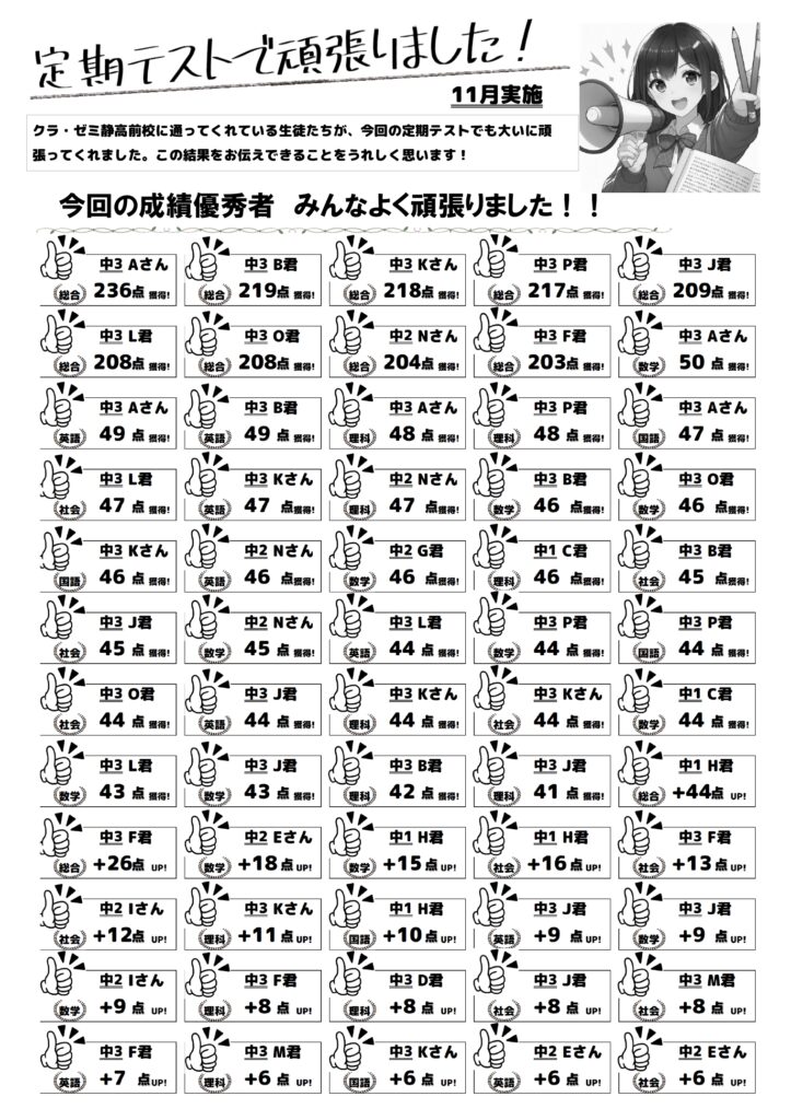【やったね🌸】定期テストで努力が花開く!静岡市葵区・クラ・ゼミ静高前校 定期テスト結果
