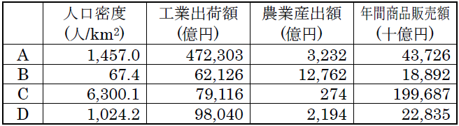 表の、AからDは、北海道、東京都、愛知県、福岡県のいずれかを示しています。