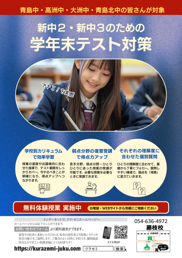 来週1月12日(月)~目標点の設定をし、予想範囲の未受講単元の受講を進めると共に、学校のワーク類に取りかかりましょう。テスト2週間前を目処に、今月中には学校のワーク類は仕上げましょう。2月に入ってからには、学校のワーク類の×直しと共に、クラ・ゼミの『定期テスト問題集』に取り組みましょう。2月8日(日)恒例のプレテスト『帰れまテン』を実施します。