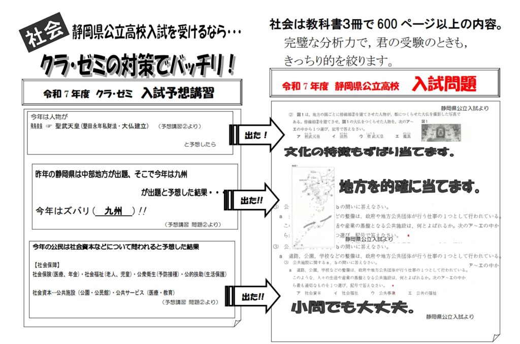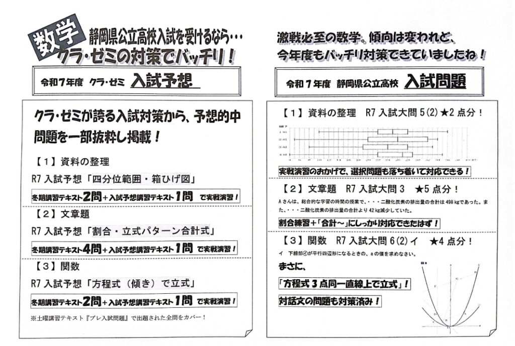 1月も終わり2月に入りました。 中学3年生は、今まさに受験生として追い込みの時期で、日々奮闘していると思います。 第一志望校合格のため、全力を尽くして欲しいと思います。 我々クラ・ゼミ講師陣・スタッフ一同、全力でサポートいたします! 本日は、クラ・ゼミが受験生へ向けて最後に実施する【入試予想講習】について、ご案内します。 例年キャンセル待ちが出るほどの盛況ぶりです。 静岡県の入試で合格を勝ち取るためには、 【内申点】 と 【入試本番のテストを突破する力】の2つが必要です! クラ・ゼミでは、これまで受験生の皆さんの学力を、 夏の夏期講習の土台固めに始まり、土曜講習、冬期講習、入試直前講習とステップUP型で鍛えてきました。 そして、いよいよ入試本番の緊張の中でも、自分の持っている力を十二分に発揮するための総仕上げとして【入試予想講習】を実施します。 予想講習とは、 過去10年分、20年分の入試傾向を踏まえ、 その名の通り、◆今年の入試では何が出題されるのか を各科目大胆にも予想し対策をします! ※2025入試的中掲示【数学・社会】より その中で、 ・予想問題を含め、知識面での安心感を得ること ・本番の緊張下でいかに自分の持っている力を発揮するか、メンタル面での戦略 等もお伝えします。 ★入試予想講習 【日程】1回目:2/15、2回目:2/22(日) 【時間帯】9:30~16:00 【場所】キラリ高等学校 浜松スクーリング会場 浜松市中区板屋町689番地 第一志望校絶対合格!を目指して一緒に頑張りましょう! 我々クラ・ゼミ講師陣・スタッフ一同、全力でサポートいたします!