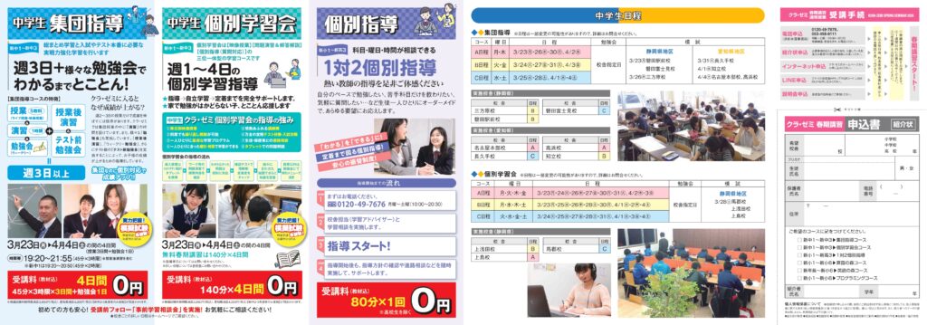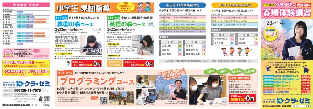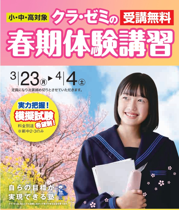 さて、いよいよクラ・ゼミ2026年春期講習のご案内が始まりました!今回の春期講習も多くの講座を無料で受講していただけます。春は新しいことをスタートするのに最適な時期です。「今までの勉強法を変えたい」「勉強時間を延ばすためにどうしたらいい?」「新学年は今よりも成績をアップしたい」「中学入試・高校入試・大学入試の準備を何から始めたらいいのか相談したい」「勉強の目標を持って頑張りたい」など、クラ・ゼミ長久手校では皆さんと一緒に最適な勉強法・進学先を考えます。ぜひお気軽にお問合せ下さい!