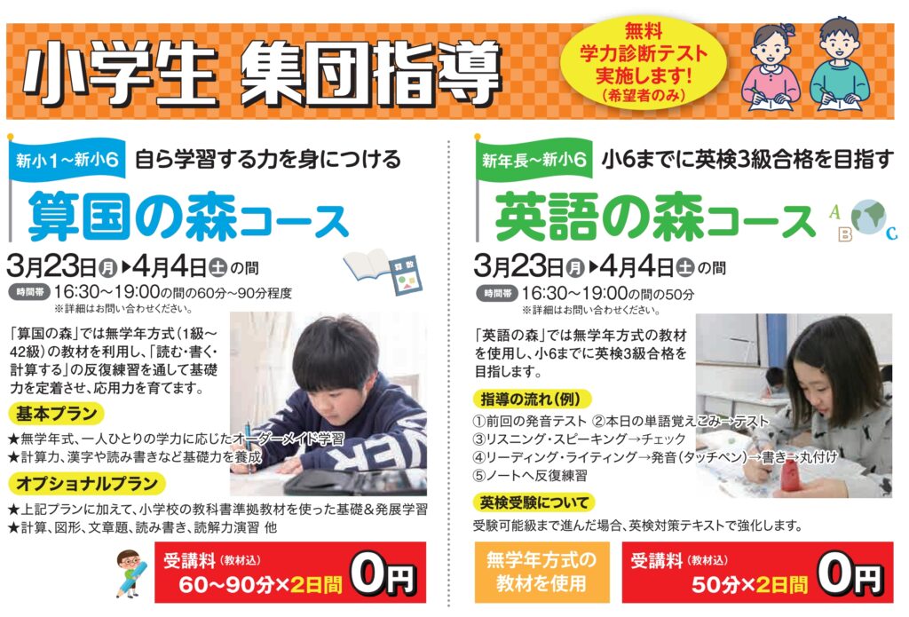 ~誰にだって輝ける舞台がある!~ クラ・ゼミが掲げるのは【親身な指導】と【第一志望校全員合格】です。 クラ・ゼミの講師スタッフが全力でサポートします! ======== クラ・ゼミの春期講習生の募集中です。 富士見校でも全コースの募集がスタートしています! しかし、いきなり申込は…、資料請求?クラ・ゼミに直接電話?…などあるかもしれません。ですので、今回は『春期講習に興味はあるけれど…もう少し知りたい!』にお答えしたいと思います。 クラ・ゼミ富士見校では、小学生コースとして算国の森・英語の森コースを実施していますが、今回は小学生コース(英語の森)の【春期講習の意図・内容】についてご紹介します。 【英語の森コース】 <基本情報> ・対象学年:年長~6年生 ・指導科目:英語 ・実施曜日(※富士見校):月・水・土曜日※算国の森指導の実施曜日と同じ ※振替指導も可能です。 ・指導時間:16:30~19:00の間で50分程度。 以前の新学習指導要領の変更以降、『中学での定期テストが単元・内容的にもかなり難しくなった!』という声をよくお聞きする通り、今までにない問題形式が出題されたり自らを表現する問題も増えています。 また、中学英語は小学校で既に英語を習ってるという前提から始まり、特に書き(ライティング)・読み(リーディング)は以前に比べるとスピード感を持って進むので、初めてのお子様は苦手意識を持ちやすくなっているようです。 このように小中学校での英語ギャップがある中、中学へ向けてどのような準備をすれば良いのかご心配されている保護者の方も多いのではないでしょうか。 そこで、クラ・ゼミではそのギャップを埋め、自信をもって中学英語に進んでもらうために、【英語の森コース】があります。 このコースのコンセプトは、【小学校6年生までに英検3級を目指す】です。 最大のポイントは 無学年方式の教材により『個々のお子様のレベル・ご要望に応じた学習が可能』です。 学年ではなく、「級」(1級から40級)でテキストのレベルが分けられているので、 苦手な単元は理解ができるまでじっくりと学習、習得できた単元は次々とレベルの高い問題へのチャレンジができます。 基礎力をつけることはもちろん、中学生になってから力が発揮できること、年に3回英検への挑戦が クラ・ゼミではできます! 授業(指導)の流れ ➀【前回の復習】 宿題チェック、前回の単語・英文の読みの確認します。※宿題は毎回出します。ライティング中心です。 ②【今日の内容】 新しい単元の単語や基本文について ・聞く(リスニング)・話す(スピーキング):タッチペンを用いてネイティブによる音の確認と発音練習。 →自分で聞く・発音練習するだけではなく、先生による発音チェック・修正、文法についての説明もあります! ・書く(ライティング):聞いた音や理解した単語や基本文について、今度は真似して丁寧に書く練習をします。 →自分で書くだけではなく、先生によるスペルチェックや直しもあります! ※読む(リーディング):級が進むと読む内容も増え、読解問題が加わります。 ③【今日のまとめ・宿題の確認】 ・今日一日の学習定着を確認。 ・宿題の確認 ※宿題を自分で復習できるかどうか、確認をして出します。 習い始めと身に付くまで継続的な学習が大切ですね! ★春期講習の意図・内容について 4月から学年が1つ上がり学習環境も変わります。 心機一転、新しい学年で『勉強を頑張ろう!』という気持ちが1年で一番強くなるのもこの時期の特徴です。新学年の準備を3月から始めて良いスタートダッシュを切ることができます。 春休みの特徴は、 学年の変わり目なので、例年学校からはあまり宿題が出ません(比較的時間に余裕があります)。 よって、春期講習のポイントは、 この時期を利用して、 これまでの復習や新しい学習習慣作りをします! 【春期講習】では、 この英語の森指導を2回分を体験可能です。 ※ちなみに…クラ・ゼミ富士見校に普段お通いのお子様だからこそのメリット 1.クラ・ゼミは英検の準会場にもなっているので年3回受験可能です(※キラリ高等学校にて)。習熟度の確認や目標を持った学習も可能です。 2.春期講習期間(3/23~4/4)だけでなく、【春休み期間中を通して】つまり約1ヶ月の間、目的を持った継続的な指導が可能になります。 以上、英語の森コースの【春期講習の意図・内容】についてご紹介しましたが、春期講習の予約や無料学習相談もまだ間に合います。 この機会に是非お問合せ下さい。一緒に『分かる』から自分で『できる』、そして自信につながる!をクラ・ゼミで実感しましょう!