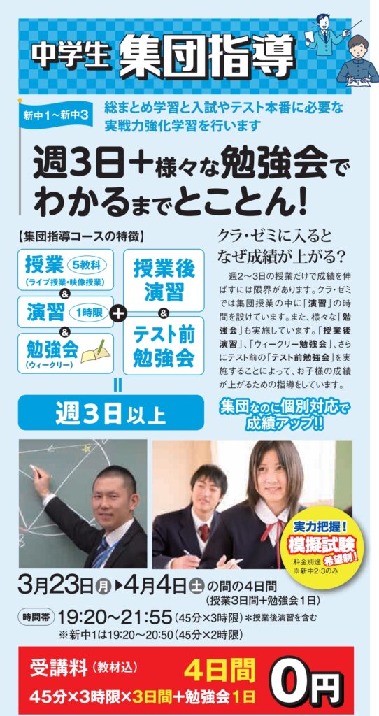 ~誰にだって輝ける舞台がある!~ クラ・ゼミが掲げるのは【親身な指導】と【第一志望校全員合格】です。 クラ・ゼミの講師スタッフが全力でサポートします! ======== クラ・ゼミの春期講習生を募集中です。 三方原校でも全コースの募集がスタートしています! しかし、いきなり申込は…、資料請求?クラ・ゼミに直接電話?…などあるかもしれません。ですので、今回は『春期講習に興味はあるけれど…もう少し知りたい!』にお答えしたいと思います。 クラ・ゼミ三方原校では、中学生コースとして集団指導・個別指導コースを実施してますが、今回は集団指導コースの【春期講習の意図・内容】についてご紹介します。 【集団指導コース】 <基本情報> ・対象学年:中学1年生~3年生 ・指導科目:5教科 ・実施曜日: ※三方原校の場合 予習授業(知識) 火曜日・金曜日 各勉強会(定着) ウィークリー勉強会:木曜日(※勉強特訓)、授業後演習(火・金21:35~22:00まで)、テスト前勉強会(テスト前の日曜日) ・指導時間:19:30~22:00(授業+授業後演習を含む ) このコースの最大のポイントは、 『全ての教科や分野をバランス・効率よく勉強(理解)し、定着させる!集団なのに個々に対応!』です。 ただ分かった・理解したではなく、理解して自分で解けるまでとことん付き合います!そのため確保している日数や時間も週3日と多いです。また、仲間やライバルたちと一緒に切磋琢磨し、自分の持っている力以上の力を発揮できる!のも魅力の一つです! ★中学生集団指導コース:無料4日間 ◆2026春期講習の意図・内容・流れについて 4月から学年が1つ上がり学習環境も変わります。 心機一転、新しい学年で『勉強を頑張ろう!』という気持ちが1年で一番強くなるのもこの時期の特徴です。 新学年の準備を3月から始めて良いスタートダッシュを切ることができます。新しい学習習慣を手に入れるチャンスです。 学年末テスト結果や内申点、お子様の学習状況に応じて、弱点を現学年の内に把握&計画的に対策・次学年の予習をし、新しい気持ちと共に自信をもって新学年を迎えられるよう一緒に準備をします! 春休みの特徴は、 学年の変わり目なので例年学校からはあまり宿題が出ません(比較的時間に余裕があります)。 よって、春期講習のポイントは、 この時期を利用して ①新学年の予習授業をすることにより自信をもって学校の授業に臨める。 ②前学年の苦手や課題点を把握して、計画的に復習できるチャンスです。 ③これまでの勉強方法や学習習慣を再度見直すことができる。 その結果、 お子様の再度モチベーションUPや自信を持って新学年での学習をスタートできるチャンスとなります。 春期講習の流れ ①【新学年の予習授業・授業後勉強会】 →春期講習の授業にて、新学年での新しい単元を先取り予習をし、授業後勉強会にはその日の授業内容や疑問点の質問対応。 ②【現在の力の確認】 →3/26(木)静岡県統一模擬試験 現学年で身に付けておくべき知識や苦手単元や課題を把握できます。志望校に対する判定も出ます。 ※新中2・3のみ実施。有料です。 ③【分かる!自分でできる!までのやり込み】 →春期講習での演習・W勉強会にて実践的に問題を解き、分かった!から自分でできる!!までとことん付き合います。 ※新中学1年生は、中学校での授業が始まる前に、中学での勉強の仕方(問題集の進め方等)も確認できます。 以上、春期講習(中学生)集団指導コースについてご紹介しましたが、春期講習の予約や無料学習相談も可能です。 この機会に是非お問合せ下さい。 一緒に『分かる』から自分で『できる』、そして自信につながる!をクラ・ゼミで実感しましょう!