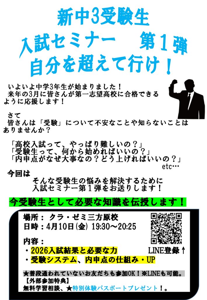 クラ・ゼミ三方原校の★特別企画です! いよいよ受験生としての1年がスタートしました。 講師スタッフ一同、第一志望校合格へ向けて全力でサポート致します! 学習塾は、 知識を伝え勉強をする場所ではありますが、それだけではありません! お子様・保護者様のご要望に応えするために、学習環境を整えたり、お子様のモチベーションUPのために様々な学習情報の提供もその使命です。 本日は、春の『入学・進級キャンペーン!の一環として、『中3入試セミナー』のお知らせです。 ※添付資料もご覧ください。 受験生のスタートとして、 普段の指導だけではお伝えできない【今だからこそ知っておくべき情報・知識】があります。 気持ちは修学旅行かもしれませんが…。 ★中3入試セミナー 【日時】4/10(金)19:30~20:25 【対象】新中学3年生のお子様 【持ち物】筆記用具、ノート ※内容等は、添付データをご確認下さい。 ◆受験を一緒に戦う仲間を募集中です。 クラ・ゼミに通われていないお友達も今回の学習イベントはご一緒に参加可能です。 お席の確保・資料準備のため、ご参加を希望の場合はその旨、予めお問合せ・ご連絡下さい。 ※LINEのご登録は、クラ・ゼミ三方原校のHPトップより可能です。 ※ご参加の方は、特別体験パスポート(1日体験+学習カウンセリング)をプレゼント! 自らの目標達成・第一志望合格、そのための新しい学習習慣を一緒に今から手に入れましょう! お気軽にお問合せ下さい。